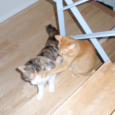 ちびっ子のコウメが体の大きい迷い猫ちゃんをはたく姿はちょっと笑えます。